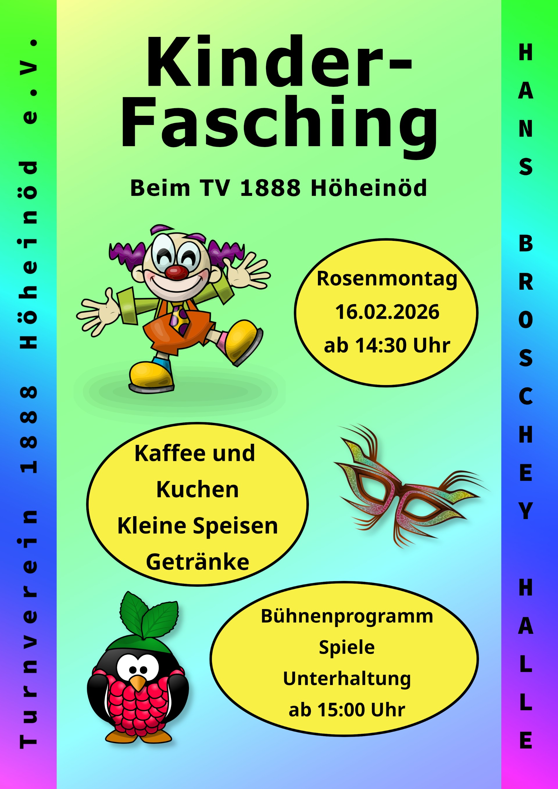 Kinder-Fasching beim Turnverein Am Rosenmontagtag (16.02.2026) findet traditionsgemäß unsere Kinder-Fasching-Veranstaltung in der Hans-Broschey-Halle zu Höheinöd statt. Neben flotter Musik stehen bei der närrischen Kinderfaschingsveranstaltung (Einlass 14.30 Uhr, Programm ab 15.00 Uhr) viele tolle Spiele, Tänze, Tanzvorführungen und Polonaisen auf dem Programm, das von unseren Übungsleiterinnen bestens vorbereitet wurde. Alle Prinzessinnen, Cowboys, Indianer, Feen, Hexen, usw. mit ihren Eltern, Großeltern, Freunden und Bekannten, sind dazu herzlich eingeladen. Wir bieten Kaffee und Kuchen, kleine Speisen und Getränke an. Der Eintritt ist frei. |